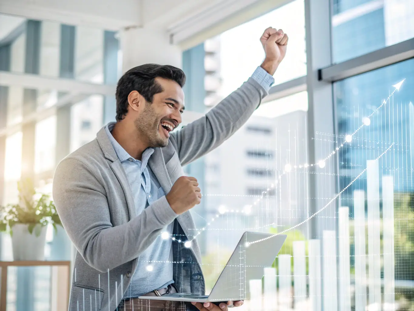 - A smiling entrepreneur in front of their small business, with financial charts overlayed.