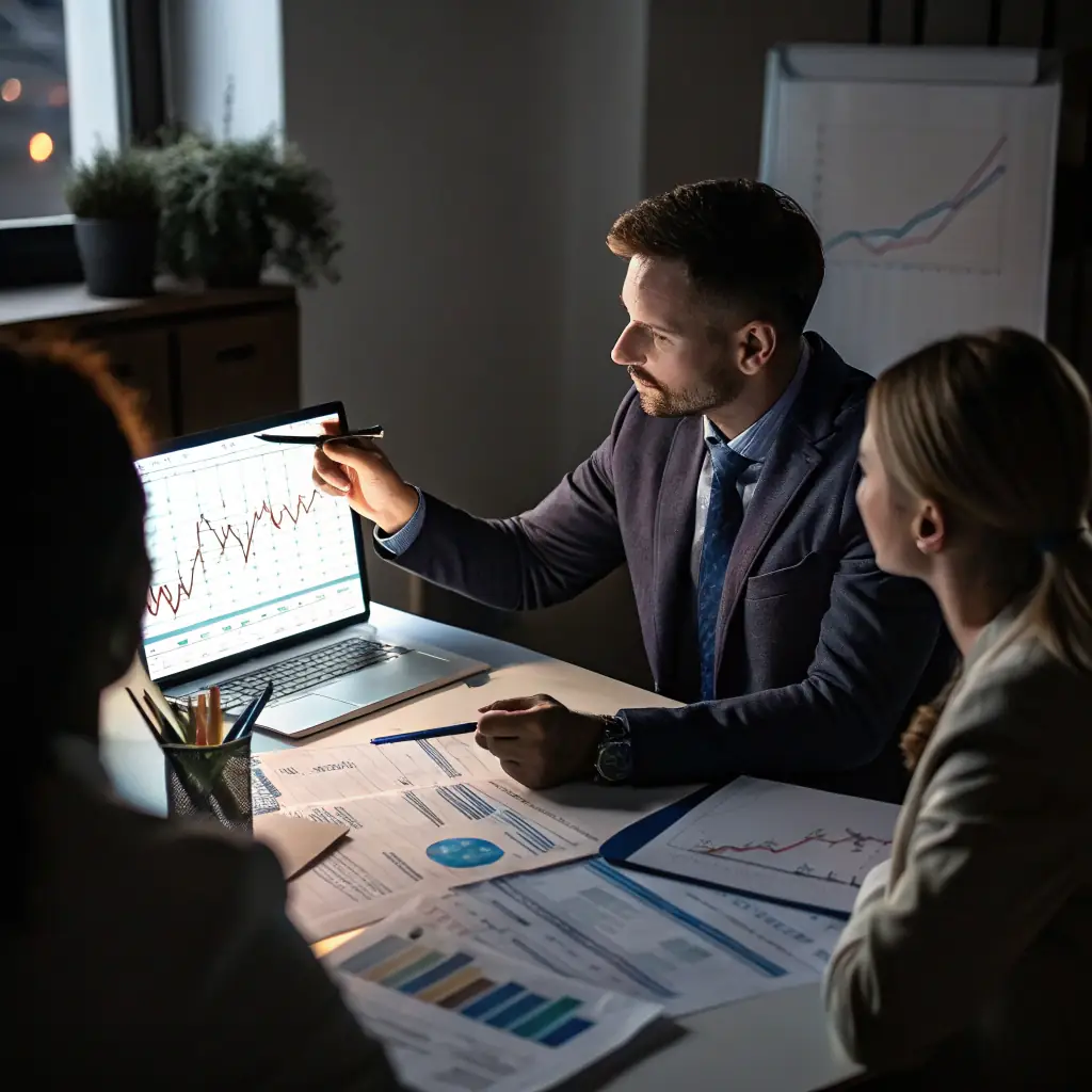 - A professional couple reviewing financial documents in a luxurious office setting.